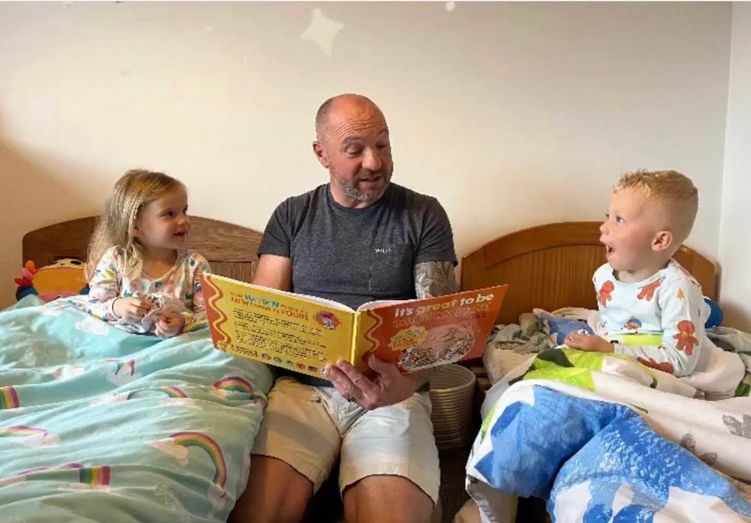 "A bedtime story. Daddy was doing the accents of the children who have their recipes. The twins couldn't stop laughing. Their big brother asked me to read it to him, I said I could read him another and he said, 'No mummy, I want to read this as it's about my sister'."